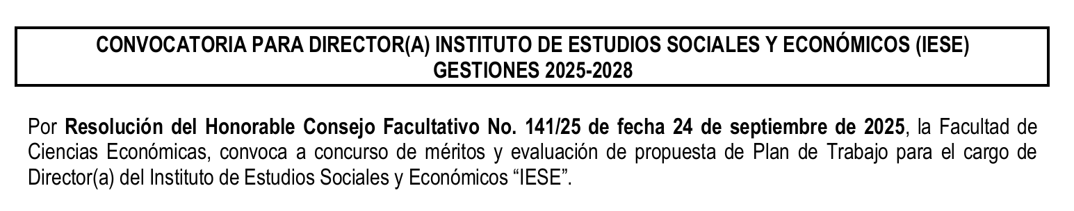 CONVOCATORIA PARA DIRECTOR(A) INSTITUTO DE ESTUDIOS SOCIALES Y ECONÓMICOS (IESE) GESTIONES 2025-2028 Descargar_Archivo_Adjunto CONVOCATORIA_DIRECTOR_IESE aprobada por Resolución del Honorable Consejo Facultativo No. 141-25 de fecha 24 de septiembre de 2025.pdf