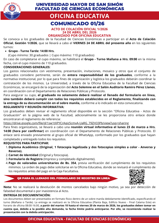 Este evento fue organizado, según lo estipulado en el Reglamento de Actos de Graduación o Colación de la Universidad Mayor de San Simón – Versión II Actualizado (Actualizado por RCU Nº 109/23 del 23 de noviembre de 2023), reglamento que señala en el Articulo 12 inciso b), que Oficina Educativa se encargará de “Verificar que todos los estudiantes graduados que llenaron el Formulario concluyeron el Plan de Estudios y con el Tramite del Diploma Académico".