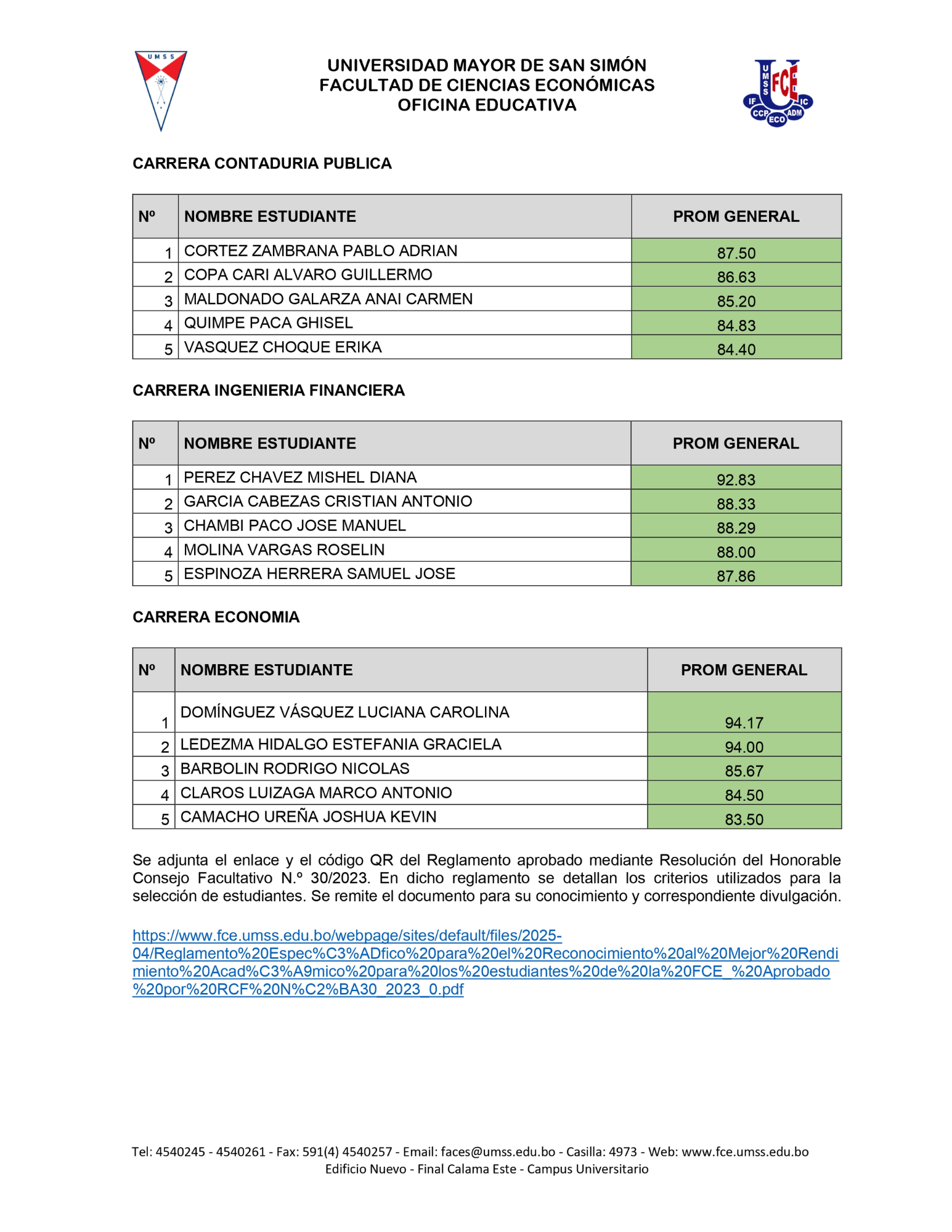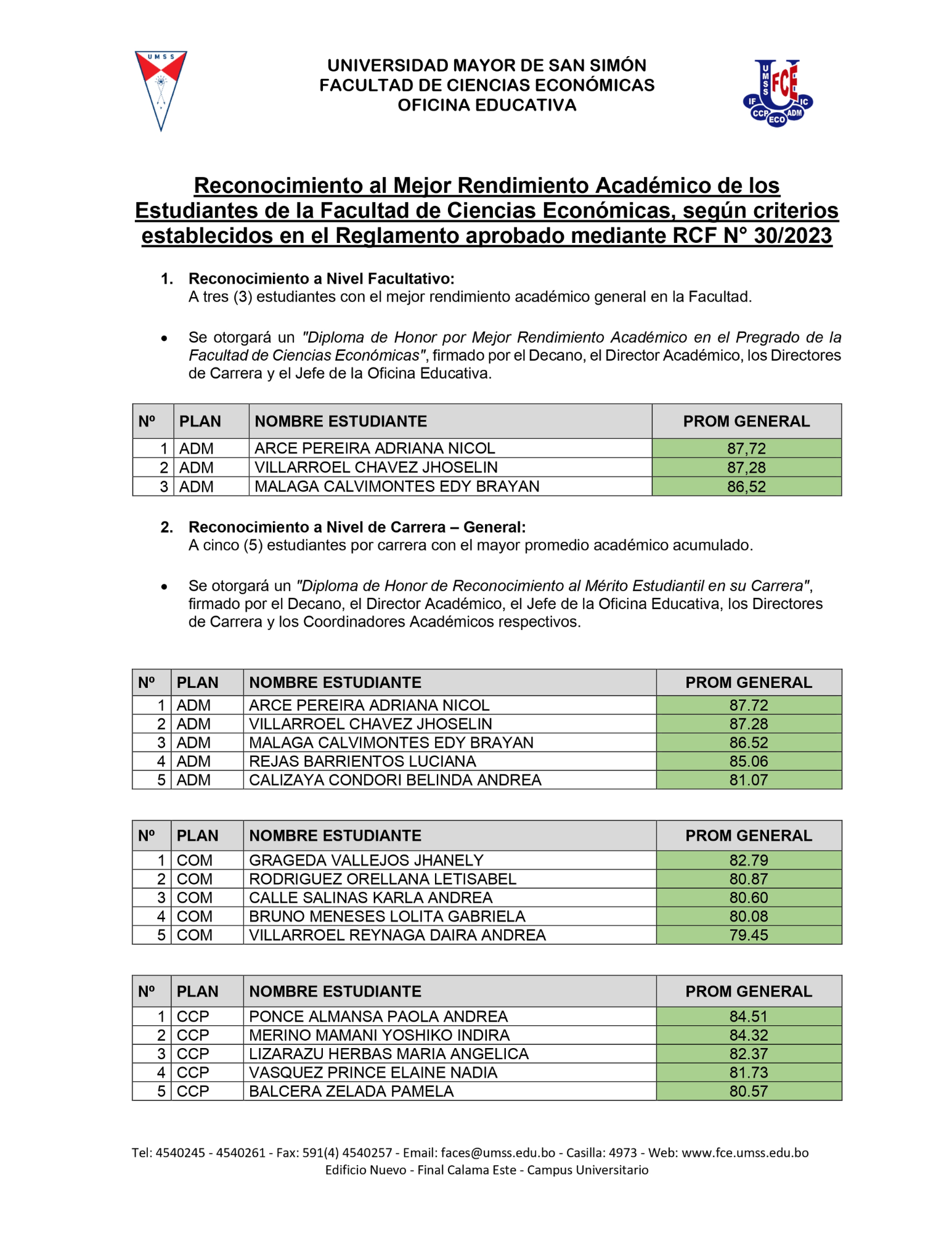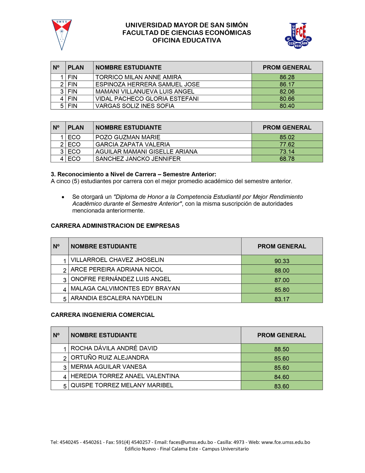 Reconocimiento al Mejor Rendimiento Académico para los Estudiantes de la Facultad de Ciencias Económicas - Realizado el 23 de Abril del 2025