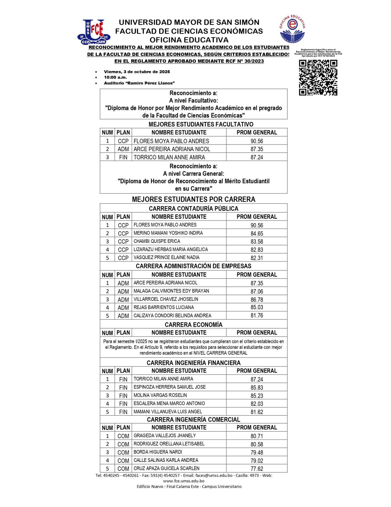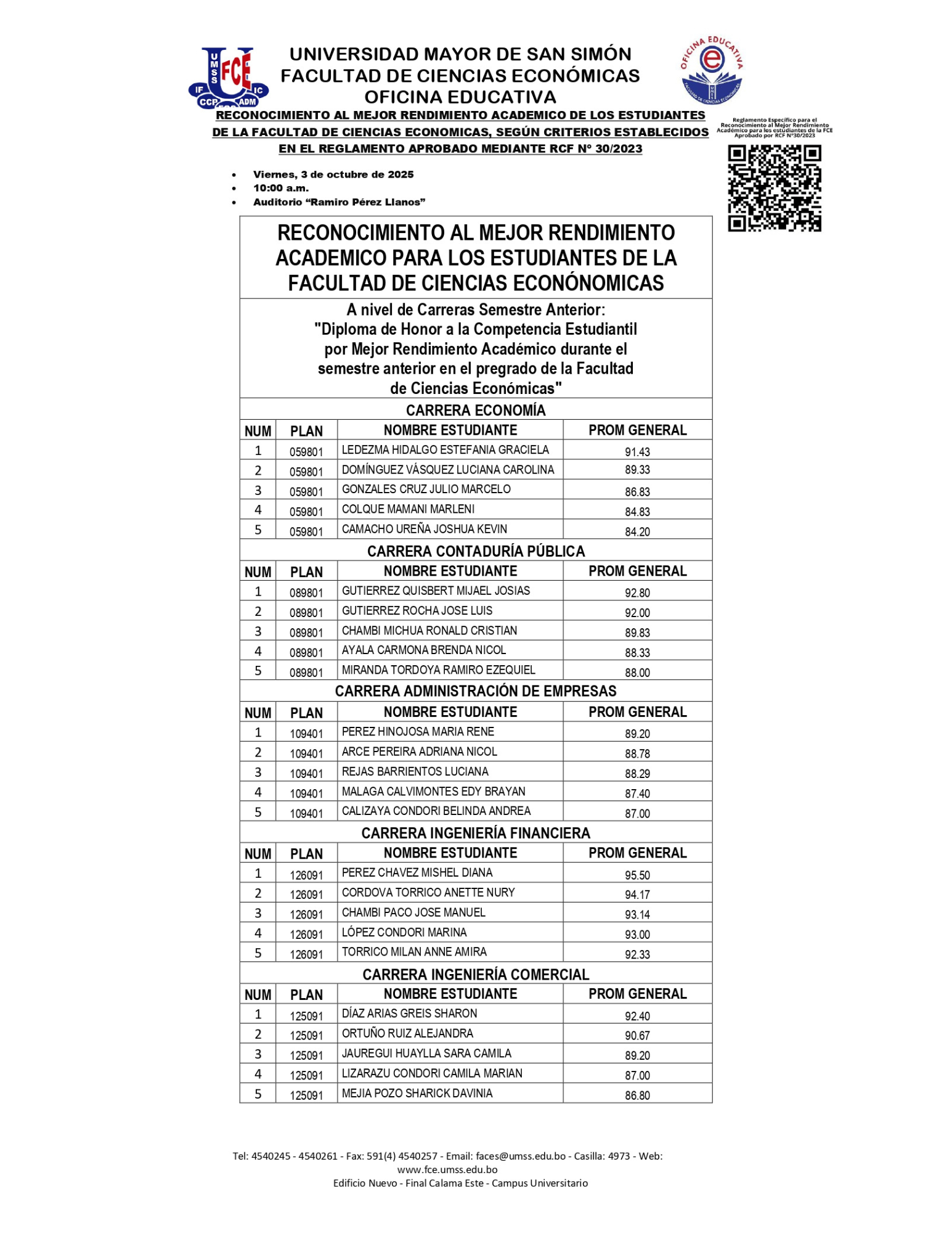 Reconocimiento al Mejor Rendimiento Académico para los Estudiantes de la Facultad de Ciencias Económicas - Realizado el 3 de Octubre del 2025